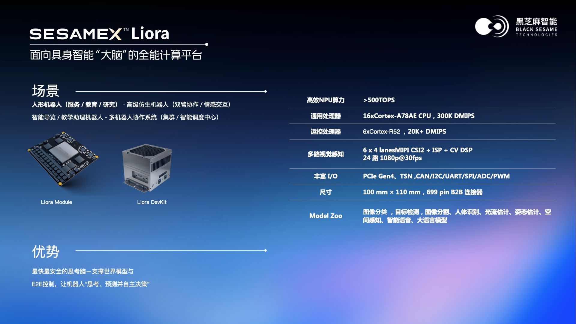 Liora 面向具身智能“大脑”的全能计算平台,是SesameX平台家族中最快、最安全的机器人大脑,支持世界模型与端到端控制,让机器人“思考、预测并自主决策”。其最高算力可达近600 TOPS,CNN及Transformer的超融合计算架构,能同时处理语音、视觉、触觉与行为决策等复杂任务。Liora适用于具身智能的人形机器人场景,包括:服务或教育人形机器人、双臂协作机器人、情感交互机器人等。