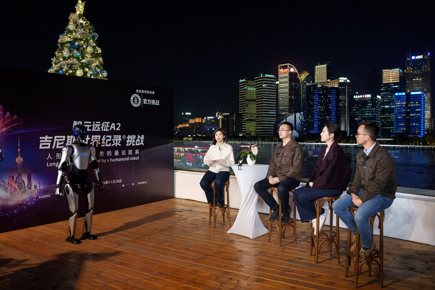 11月20日,上海外滩直播间内,吉尼斯世界纪录认证官胡晓雯女士现场宣读认证结果:智元远征A2(SNA210041BA00652号机器人)全程行走距离106.286公里,成功创造“人形机器人行走最远距离”世界纪录。
