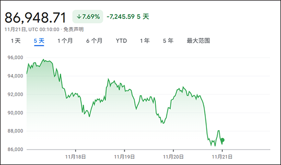 当地时间11月19日,比特币(BTC)价格延续跌势,较10月初创下的12.6万美元历史高位回落约31%,一度跌破8.7万美元关口,收盘报每比特币8.67万美元,年内累计涨幅已全部被抹平。此前比特币的强势行情主要得益于上半年全球流动性改善与ETF增量资金的推动;随着此类资金近期快速撤离,全球市场爆仓规模估计已达数百亿美元。
