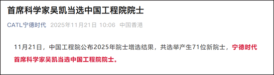 微信公众号“CATL宁德时代”消息,11月21日,中国工程院公布2025年院士增选结果,共选举产生71位新院士,宁德时代首席科学家吴凯当选中国工程院院士。
