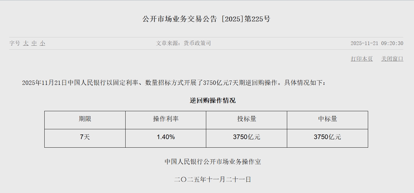 据中国人民银行网站21日消息,中国人民银行以固定利率、数量招标方式开展了3750亿元7天期逆回购操作。因今日有2128亿元7天期逆回购到期,当日实现净投放1622亿元。