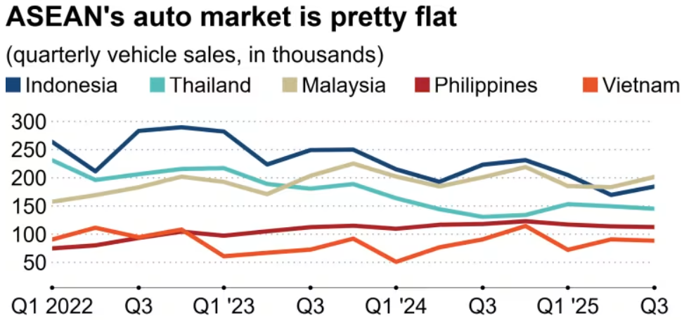 据《日经亚洲》21日报道,东南亚五大汽车市场(印度尼西亚、马来西亚、泰国、菲律宾、越南)第三季度销量数据显示,日系车长期稳固的市场铜墙铁壁正被“攻破”,需求整加速转向电动汽车。