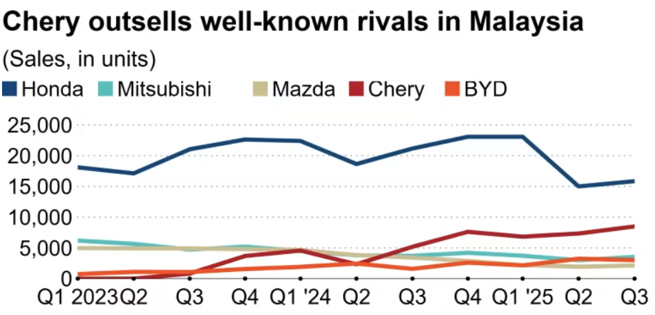 作为东盟最大经济体的印尼,中国电动汽车龙头品牌比亚迪首次实现销量登顶,成为当地最畅销车型的代名词;而连续两个季度蝉联东南亚汽车销量冠军的马来西亚,也因中国车企(尤其奇瑞汽车)的崛起,市场份额分布出现显著变动。