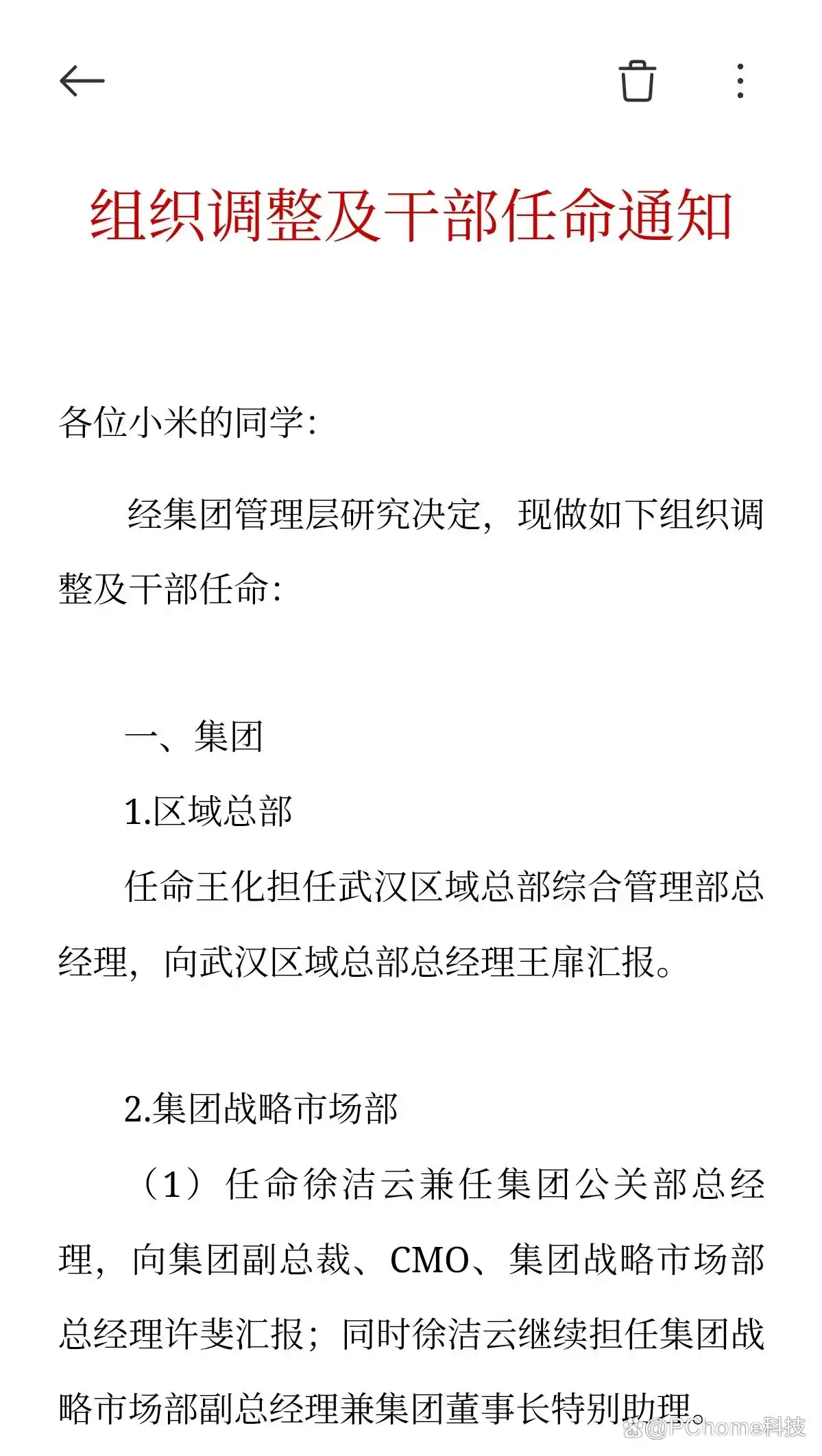 多个自媒体曝光的一份小米任命通知显示,王化担任武汉区域总部综合管理部总经理,向武汉区域总部总经理王扉汇报。徐洁云继续担任集团战略市场部副总经理兼集团董事长特别助理的同时,兼任集团公关部总经理,向向集团副总裁、CMO、集团战略市场部总经理许斐汇报。