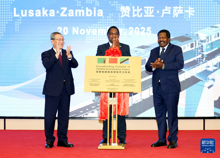 当地时间11月20日,国务院总理李强在卢萨卡同赞比亚总统希奇莱马、坦桑尼亚副总统恩钦比共同出席坦赞铁路激活项目开工仪式。新华社记者 姚大伟 摄