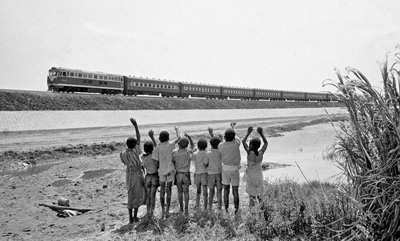 赞比亚鲁西瓦西湖畔的少年儿童欢迎坦赞铁路的列车通到他们的家乡(1976年摄)。 图自央视新闻