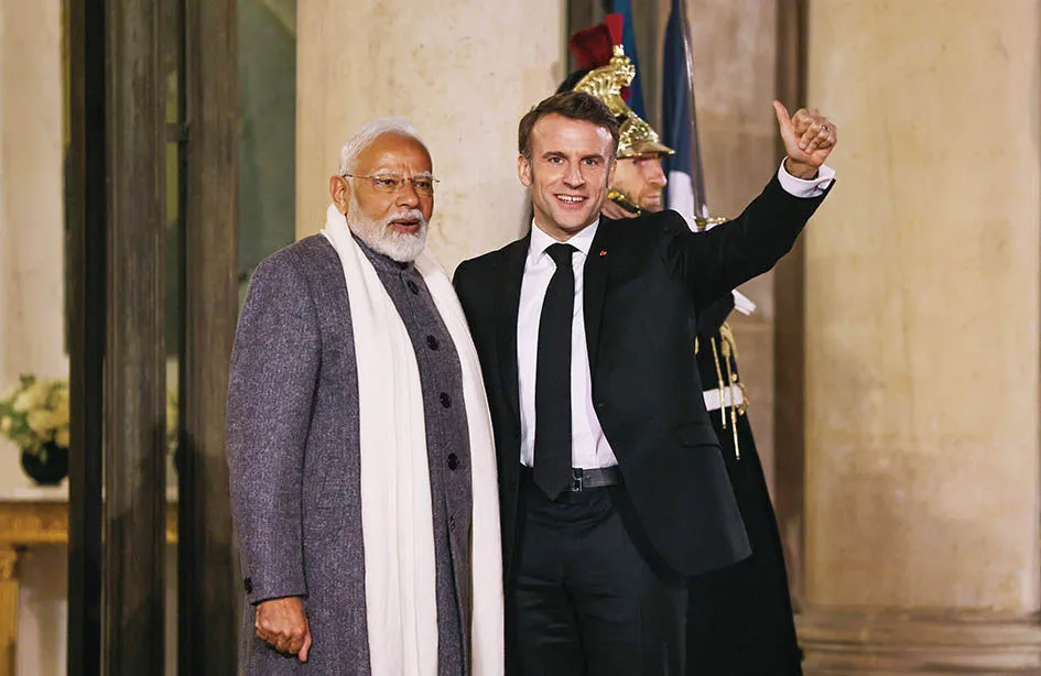 2月10日,在法国巴黎总统府爱丽舍宫,法国总统马克龙(右)与印度总理莫迪准备出席欢迎晚宴。为期两天的人工智能行动峰会10日在法国首都巴黎的大皇宫拉开帷幕。图源:《环球》杂志