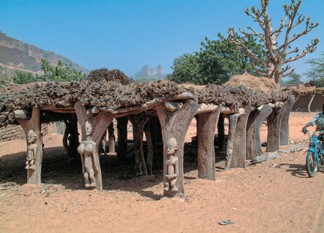 图1-6(上)利用自然树丫做柱。辅以绑扎节点。四川凉山美姑县古托村鸡舍图1-7(下)西非托古纳(Toguna)村落公共房屋利用天然树丫做支柱(Wikipedia.Taguelmoust. https://commons.wikimedia.org/wiki/File:Togunat_01.JPG)