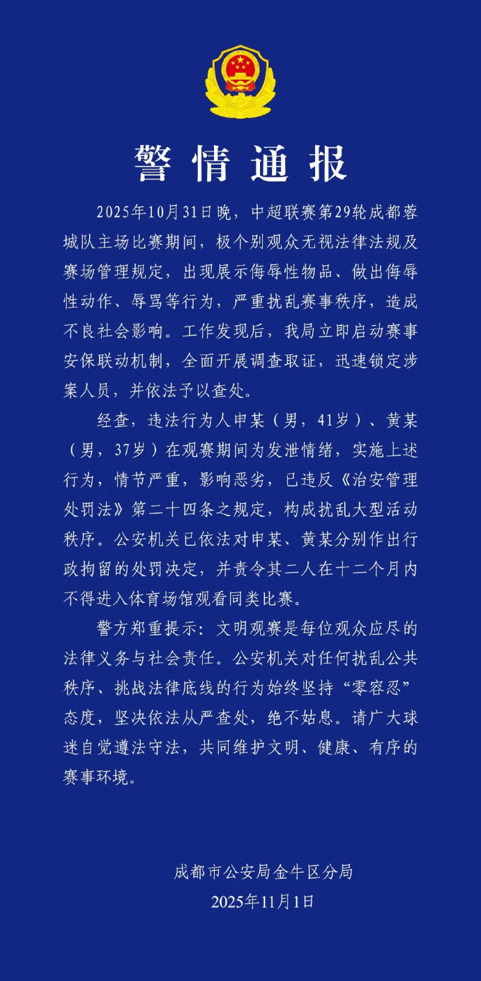 此前,成都市公安局金牛区分局11月1日发布警情通报,违法行为人申某(男,41岁)、黄某(男,37岁)已被依法作出行政拘留的处罚决定,并责令其二人在十二个月内不得进入体育场馆观看同类比赛。