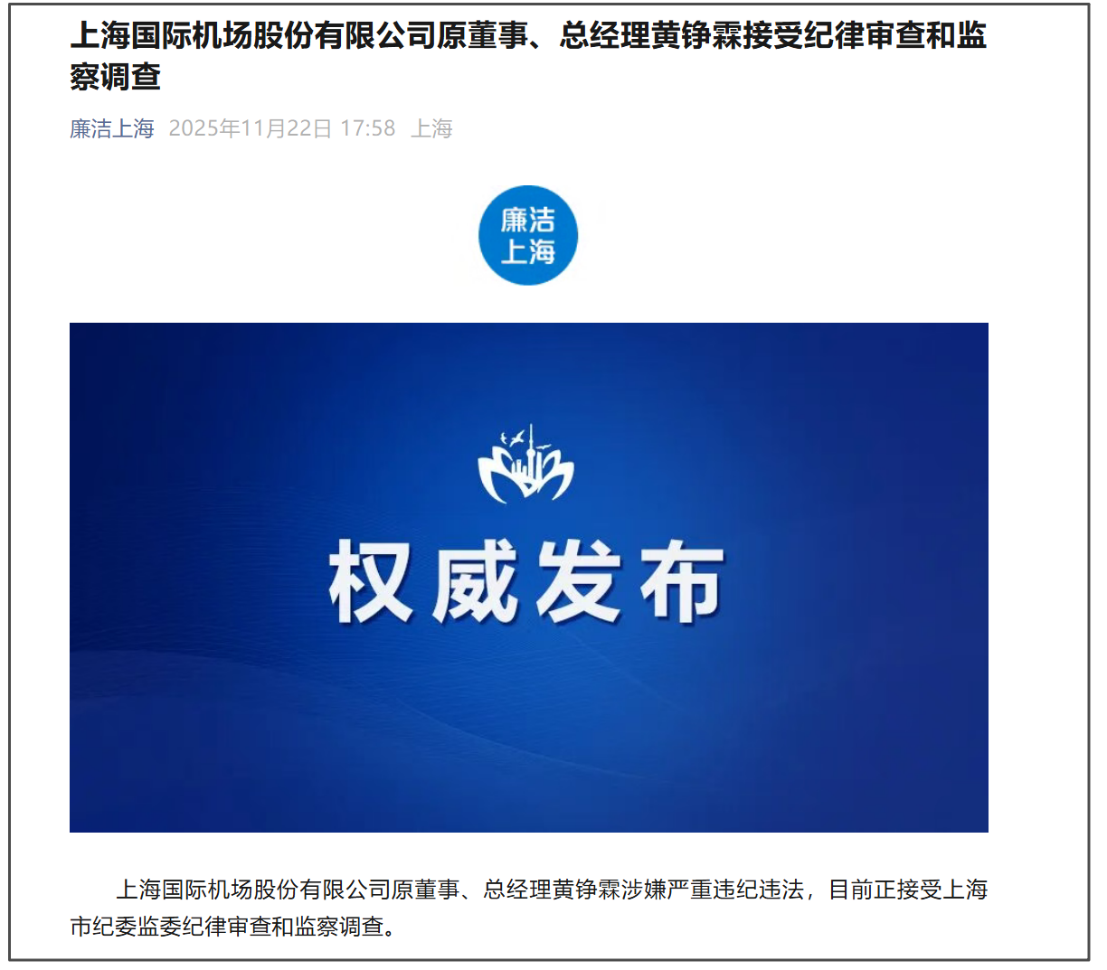 上海国际机场股份有限公司原董事、总经理黄铮霖接受纪律审查和监察调查 guancha 2025-11-22 微信公众号“廉洁上海”11月22日消息,上海国际机场股份有限公司原董事、总经理黄铮霖涉嫌严重违纪违法,目前正接受上海市纪委监委纪律审查和监察调查。