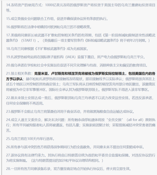除了谈判条件极端不利于乌克兰,特朗普甚至还规定时间表:谈判在11月27日感恩节之前签署协议,该过程将在12月初之前完成。乌克兰最高拉达议员贡恰连科公布了特朗普制定的乌克兰和平计划28项内容,内容如下: