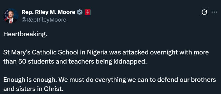 最新绑架事件发生后,美国西弗吉尼亚州共和党众议员莱利·摩尔发文称,圣玛丽学校的情况“令人心碎”。他写道:“够了。我们必须尽一切努力保护我们的基督徒兄弟姐妹。”特朗普已任命摩尔领导对尼日利亚基督徒被杀事件的调查。