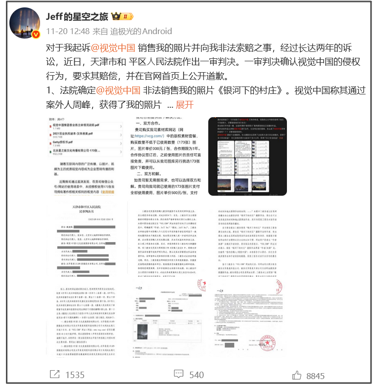 摄影师戴建峰(@Jeff的星空之旅 )11月20日发文表示,对于其起诉视觉中国销售他的照片并向他非法索赔之事,经过长达两年的诉讼,近日,天津市和平区⼈民法院作出一审判决。一审判决确认视觉中国的侵权行为,要求其赔偿,并在官网首页上公开道歉。