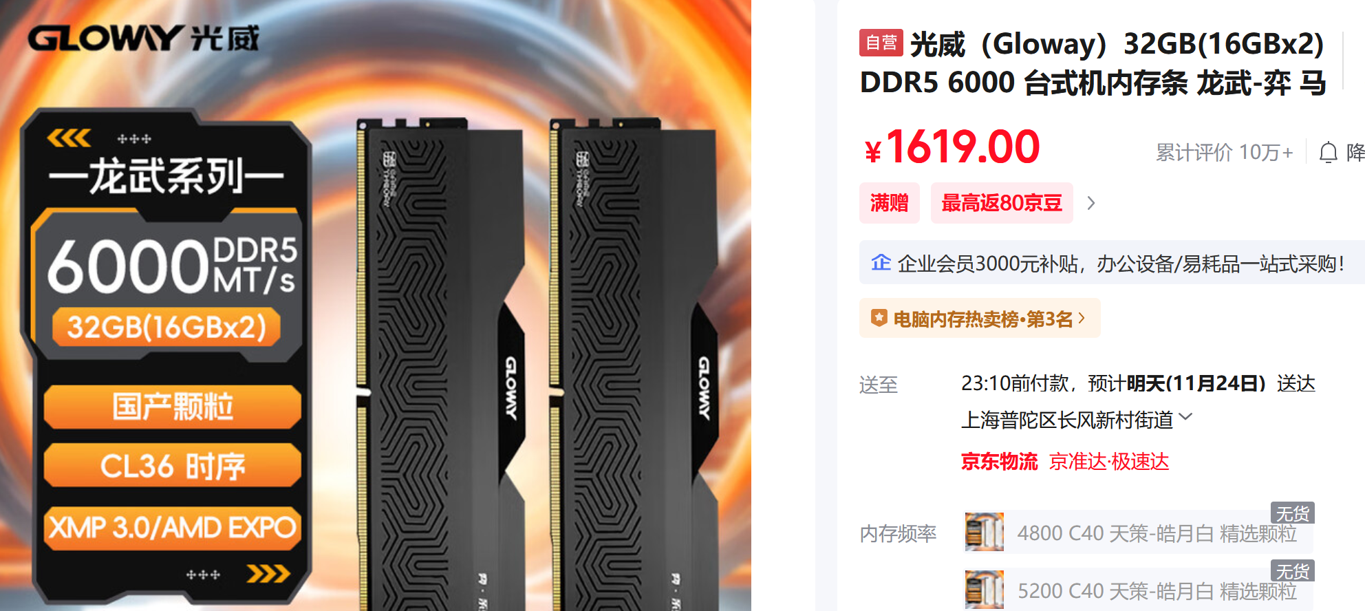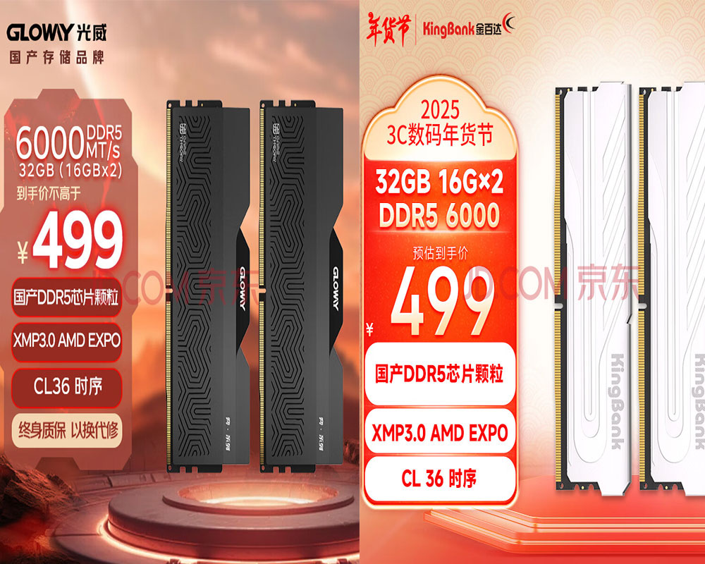 国产内存条的价格也在水涨船高。去年12月,在京东平台上,光威的国产DDR5颗粒内存条(6000CL36规格16*2套条)到手价还不高于499元,现在售价已达1619元。