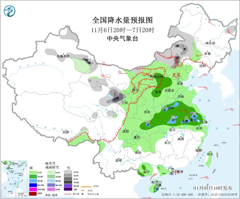 *11月5日20时至6日20时,*新疆中北部、甘肃河西、内蒙古东部、黑龙江中东部、青海中部、西藏南部等地部分地区有小到中雪或雨夹雪,其中,新疆西北部等地部地区有大到暴雪,局地大暴雪(20~28毫米),新增积雪深度4~8厘米,局地10厘米以上。新疆沿天山地区和南疆盆地、甘肃北部、内蒙古中西部、黑龙江中南部、吉林中东部、陕西、山西、河南、四川中东部、重庆、湖北、安徽、上海、云南西部、贵州北部、湖南西北部、江西北部、浙江、海南岛中东部、台湾岛东部等地部分地区有小到中雨。内蒙古、西藏西部、青海南部等地的部分地区有4~5级风,阵风6~7级;南海海域将有9~11级风、阵风12级(见图4)。
