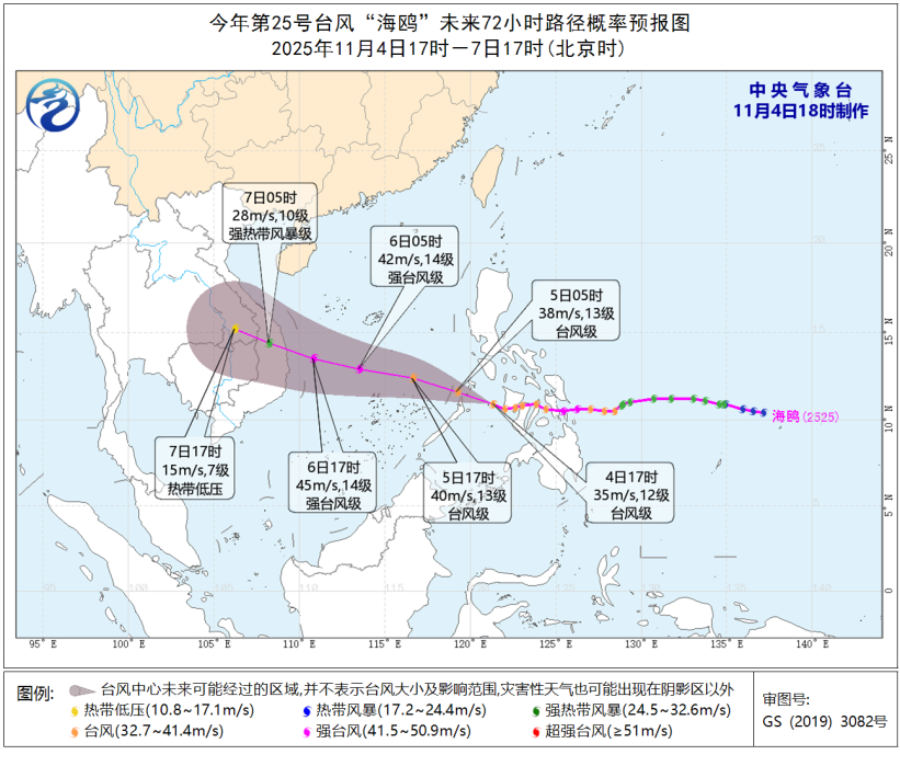 今年第25号台风“海鸥”的中心今天(4日)下午5点钟位于菲律宾苏禄海北部海面,就是北纬10.9度、东经121.3度,中心附近最大风力有12级(35米/秒),中心最低气压为970百帕,七级风圈半径200~280公里,十级风圈半径100~120公里,十二级风圈半径40公里。预计,“海鸥”将以每小时20-25公里的速度向西偏北方向移动,将于5日早晨移入南海东南部海面,强度将再度加强,最强可达强台风级(42~48米/秒,14~15级),并将于6日夜间在越南中部一带沿海登陆(35~42米/秒,12~14级,台风级或强台风级),之后强度逐渐减弱(见图1)。中央气象台11月4日18时继续发布台风蓝色预警*。*