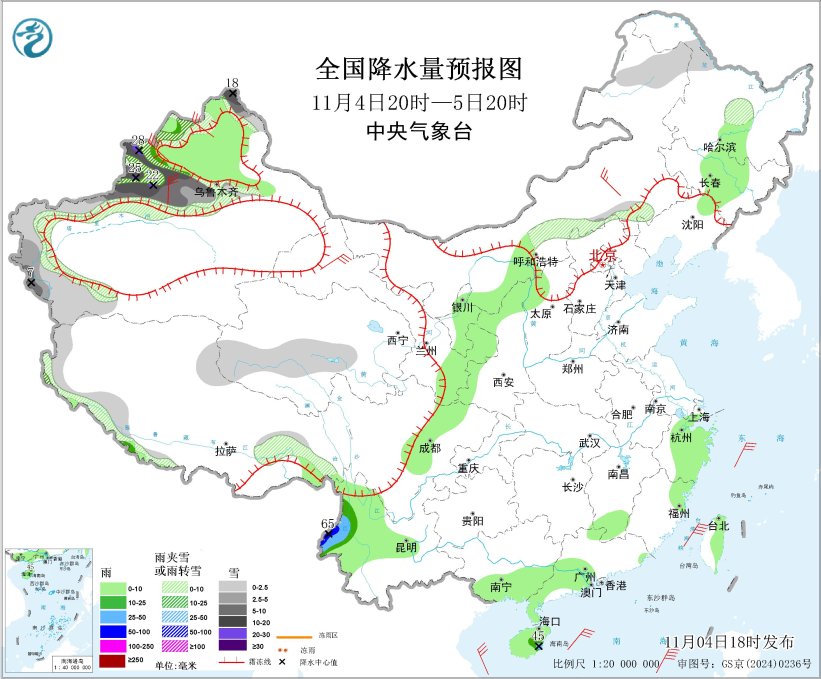 *11月4日20时至5日20时,*新疆北部和西部、青海西部和南部、内蒙古东部、黑龙江西北部、西藏西部和南部等地部分地区有小到中雪或雨夹雪,其中,新疆阿勒泰地区、沿天山地区和伊犁河谷等地部分地区有大到暴雪,局地大暴雪(20~28毫米),新增积雪2~10厘米,局地20~30厘米。云南西部、海南岛东部等地部分地区有中到大雨,其中,云南西南部局地有暴雨(50~65毫米)。新疆北部、甘肃河西、内蒙古中西部等地部分地区有4~6级风;南海东南部海域有8~10级风、阵风11~12级(见图3)。