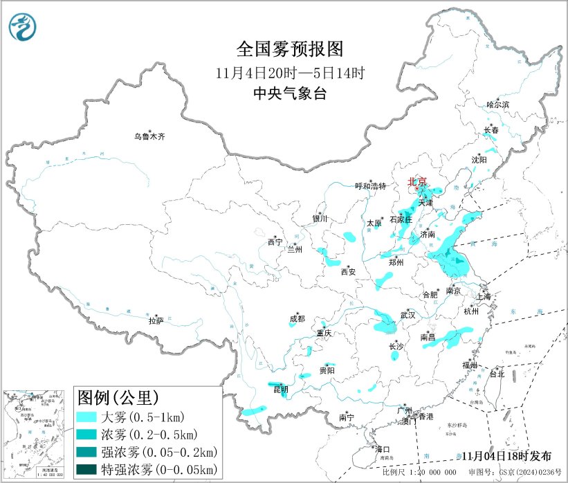 预计,11月4日夜间至5日上午,北京大部、天津、河北中南部、河南北部、山东北部和东部、江苏中北部、湖南北部、江西中部、浙江西南部、福建西北部、云南中部等地的部分地区有大雾,局地有能见度不足500米的浓雾(见图2)。中央气象台11月4日18时发布大雾黄色预警*。*