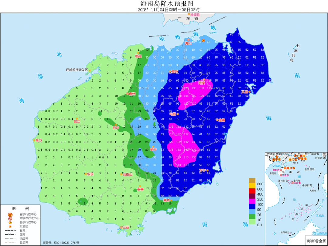 海南省气象局2025年11月04日09时20分继续发布暴雨四级预警:受偏东急流影响,预计4日,万宁、琼中、琼海、屯昌、定安等5个市县的部分乡镇将出现80-150毫米的强降水;海口、儋州、白沙、临高、文昌、澄迈等6个市县的部分乡镇将出现40-80毫米的降水,请有关单位和人员做好防范工作。