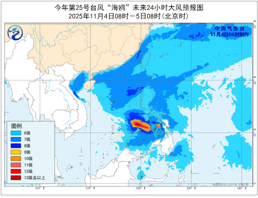 今年第25号台风“海鸥”已于昨天(3日)晚上由台风级加强为强台风级,并于今天(4日)凌晨0时前后在菲律宾莱特岛沿海登陆,登陆时中心附近最大风力达14级(42米/秒)。登陆后“海鸥”减弱为台风级,今天早晨5点钟其中心位于菲律宾群岛中部地区,距离菲律宾马尼拉东南方向大约510公里,就是北纬10.9度、东经123.8度,中心附近最大风力有13级(40米/秒),中心最低气压为960百帕,七级风圈半径200-320公里,十级风圈半径100-140公里,十二级风圈半径40-50公里。