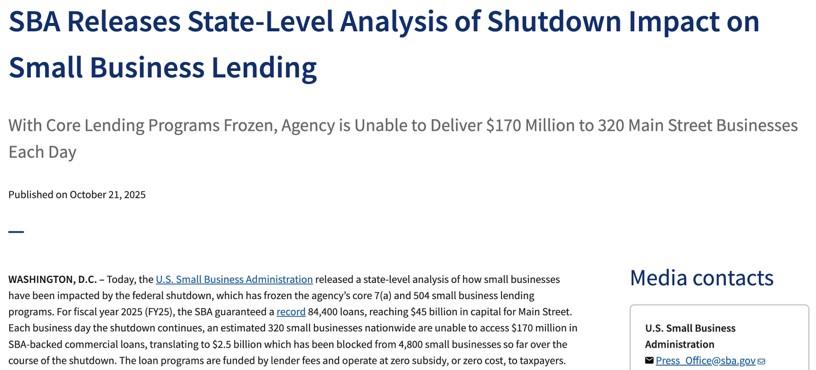 △美国小企业管理局(SBA)网站刊出分析报告,阐述政府“停摆”对小企业的影响