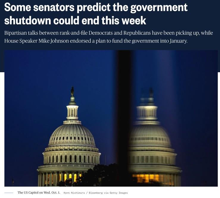 △NBC报道,有参议员预计,政府“关门”有可能本周结束