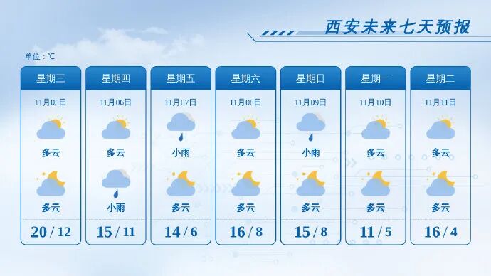 预计今天到明日白天西安市以多云到阴天气为主,空气质量为轻度污染,6日夜间至7日白天有一次小雨天气过程。受冷空气和降水影响,6日起最高气温逐步下降。另外,今天傍晚至6日有5-6级阵风。