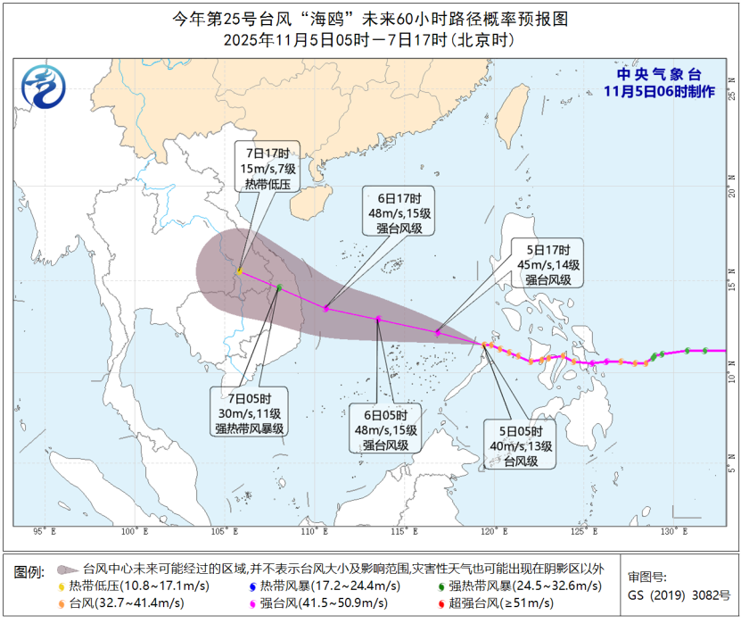 今年第25号台风“海鸥”已于今天(5日)早晨移入南海,早晨5点钟其中心位于越南嘉莱省归仁市东偏南方向约1130公里的南海东南部海面,就是北纬11.5度、东经119.4度,中心附近最大风力有13级(40米/秒),中心最低气压为960百帕,七级风圈半径250-330公里,十级风圈半径120-150公里,十二级风圈半径50公里。