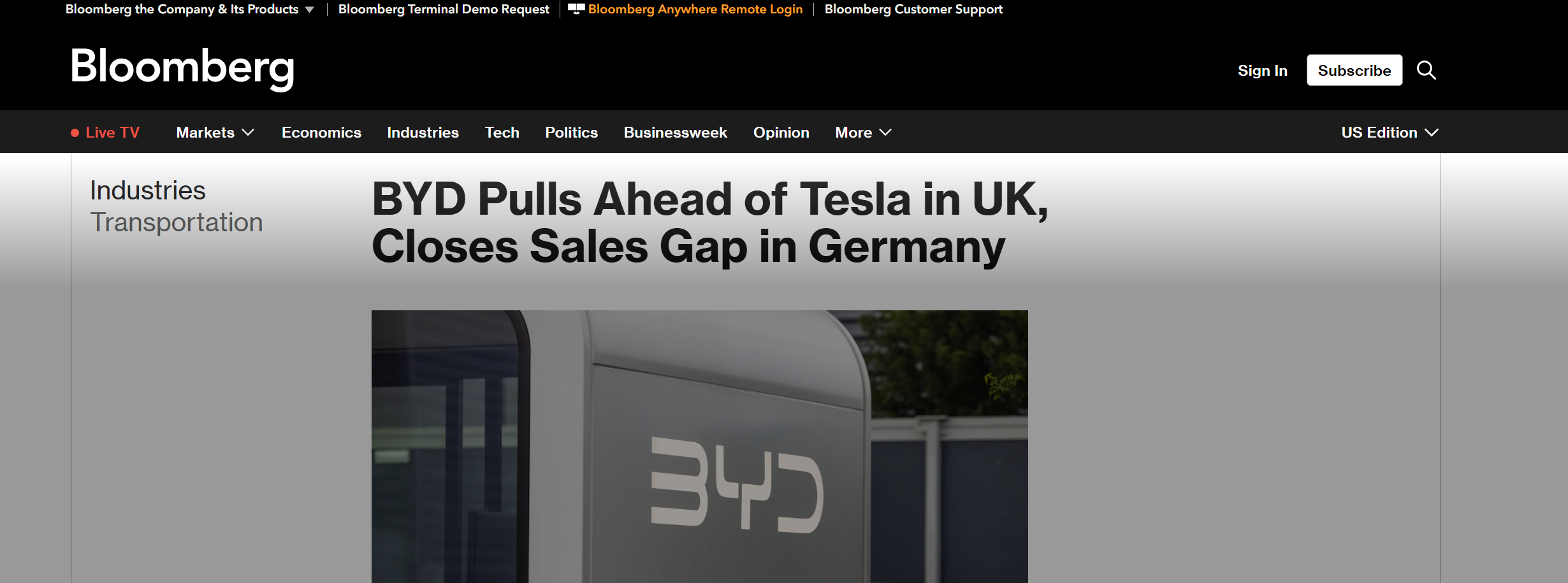 比亚迪在欧洲市场表现亮眼 英德销量领先特斯拉