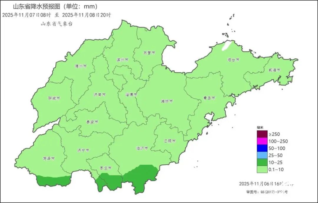 2025年11月7日08时—8日20时山东省累积降水量预报(毫米)