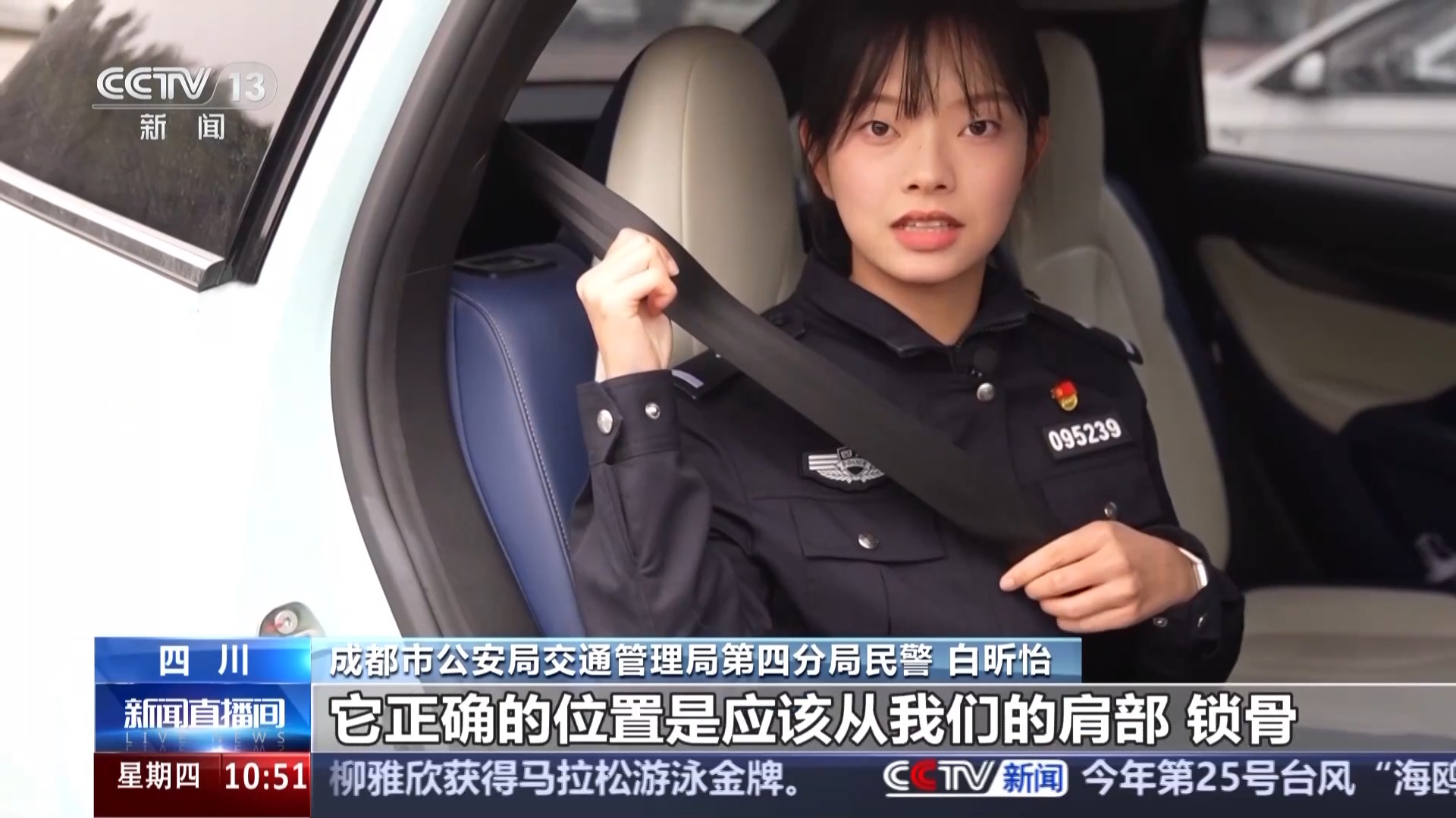 *成都市公安局交通管理局第四分局民警 白昕怡:*首先扯过来,系好卡扣,安全带正确的位置是应该从我们的肩部、锁骨再到胸前,因为肩部最受力,锁骨下方是最安全的,所以侧边的肩带就应该在这样的位置。腰带最好的位置其实是系在肚脐眼以下髋关节的位置,如果发生了比较大的冲击,冲击力是作用在我们的骨骼处,而不是在柔软的内脏的地方,就更加安全。