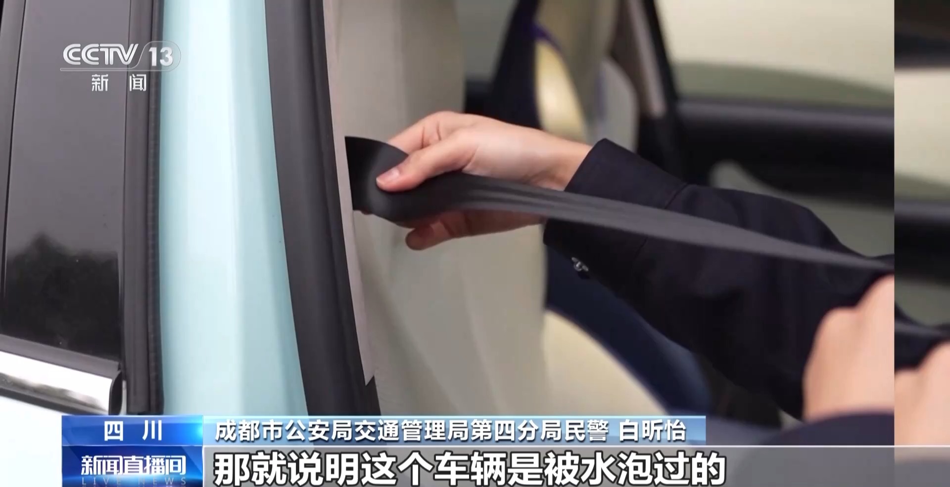 *成都市公安局交通管理局第四分局民警 白昕怡:*安全带的底部有一个标签,标签上的日期应该和我们车辆铭牌上的日期是相同的。如果两个日期不同,那就说明车辆的安全气囊被触发过,或者安全带被更换过。还有一个功能就是把安全带全部扯出来,如果底部有泥沙,就说明车辆是被水泡过的。