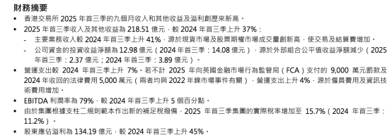 【环球网财经综合报道】11月5日,香港交易所发布2025年前三季度业绩报告,数据显示港交所总营收与净利润双双创下同期新高。今年前九个月,港交所总营收达218.51亿港元,同比增长37%;净利润134.19亿港元,同比增幅达45%。其中第三季度表现尤为亮眼,单季营收77.75亿港元,同比增长45%;净利润49亿港元,同比大涨56%。