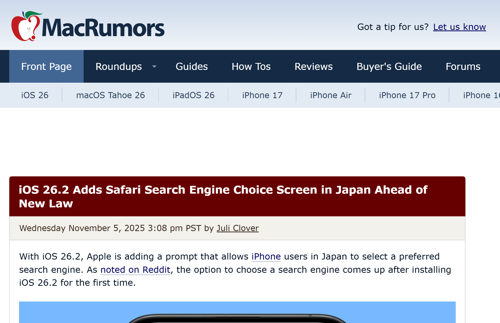这一调整的背景是日本公平交易委员会(JFTC)近期发布的《移动软件竞争法案》指导方针。该法案明确规定,操作系统在初始设置阶段需为用户提供中立的搜索引擎选择界面,旨在促进市场竞争,保障用户选择权。法案将于2025年12月18日正式生效,苹果同步在iOS 26.2正式版中落实相关功能以确保合规。