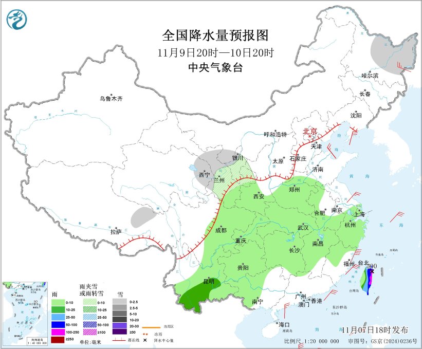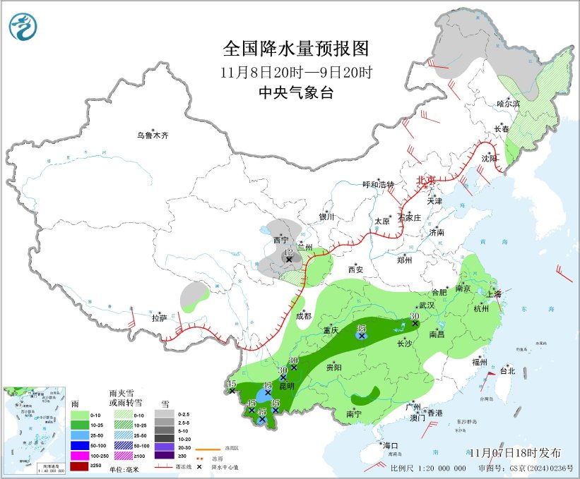 图2 全国降水量预报图(11月7日20时-8日20时)