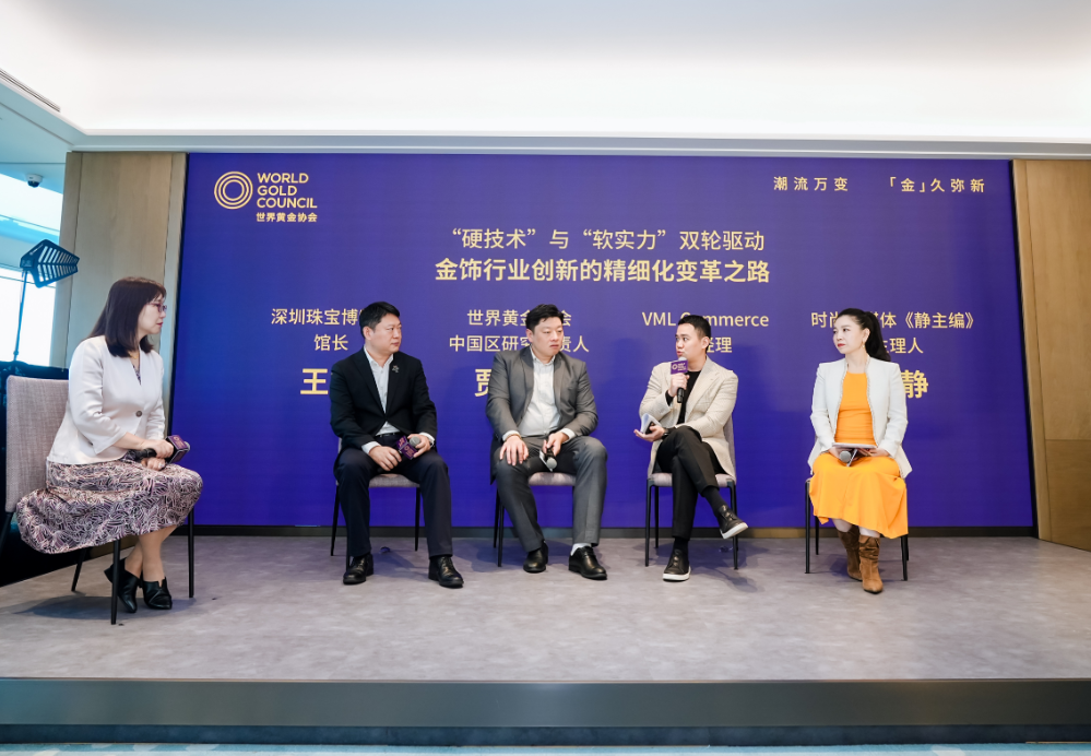 品鉴体验之后,世界黄金协会中国区传讯负责人张虹作为主持人,与深圳珠宝博物馆馆长王振、世界黄金协会中国区研究负责人贾舒畅、时尚自媒体《静主编》主理人敬静、VML Commerce总经理陈毅四位嘉宾,围绕“金饰行业创新的精细化变革之路”主题展开圆桌讨论,将活动推向思想高潮。