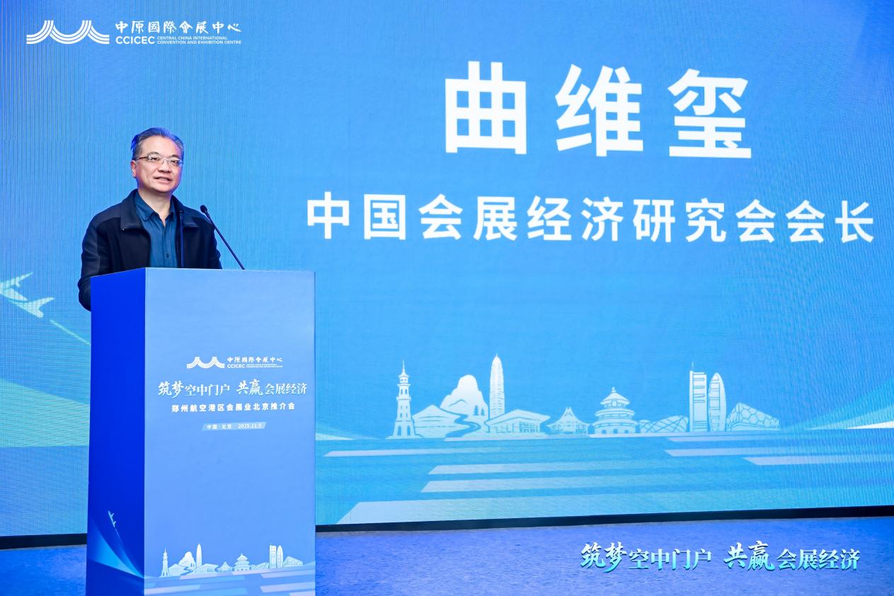 中国会展经济研究会会长曲维玺在致辞中肯定了郑州航空港区的蓬勃活力与中原国际会展中心的平台价值。他指出,会展业作为经济发展的风向标,正展现出强劲的韧性与创新态势,中原国际会展中心应抓住“十五五”规划契机,在展产融合、展城融合等方面率先发力。