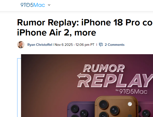 【环球网科技综合报道】11月7日消息,据外媒9to5Mac报道,有业内人士爆料称iPhone 18 Pro正测试咖啡棕、紫色、酒红三款配色,最终或保留至少一款;iPhone Air 2将延续6.5英寸屏设计,拟新增4800万像素超广角镜头,从单摄升级为双摄,以提升高端感。