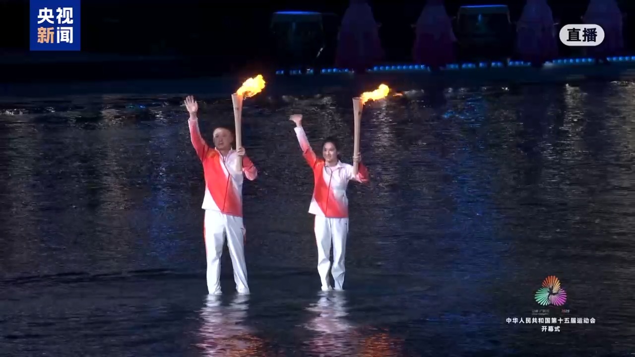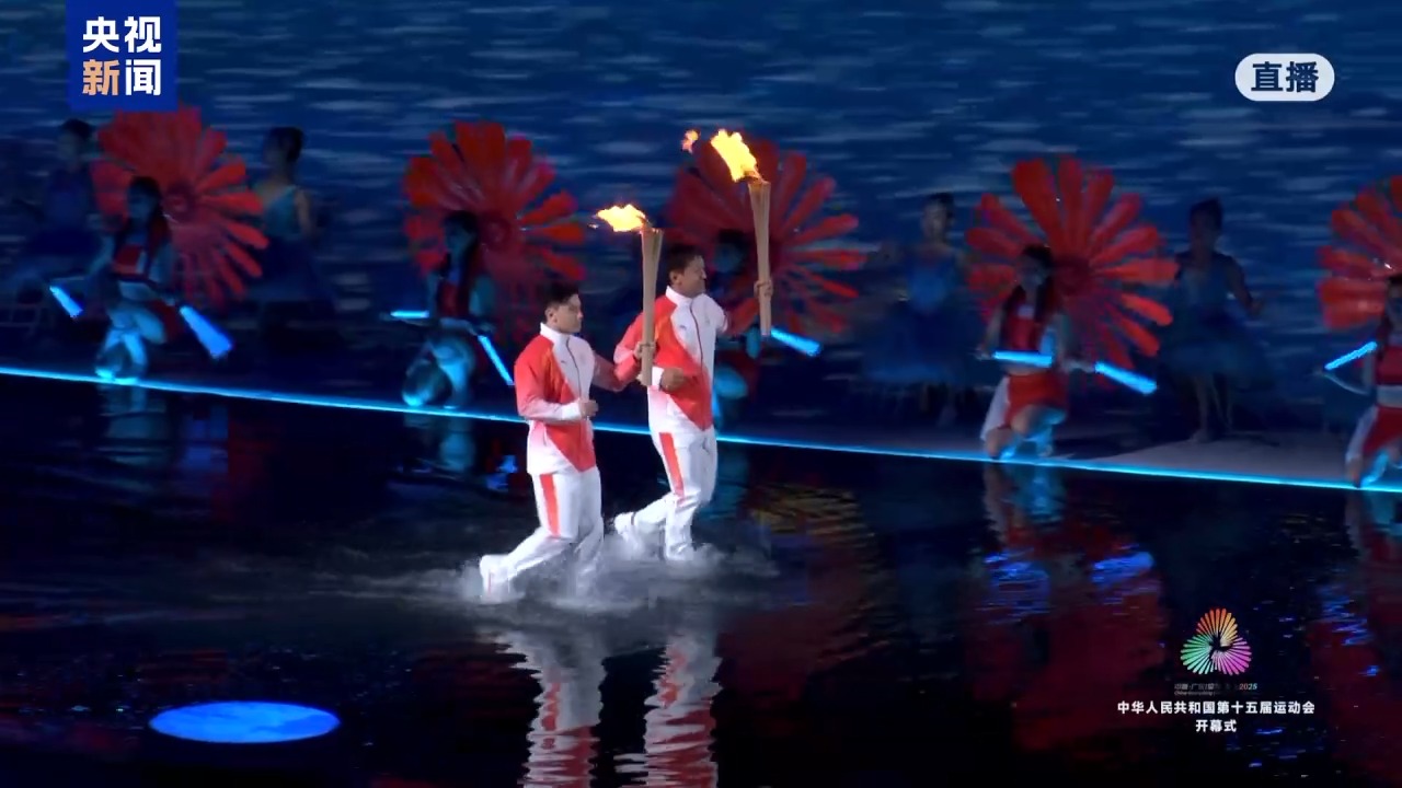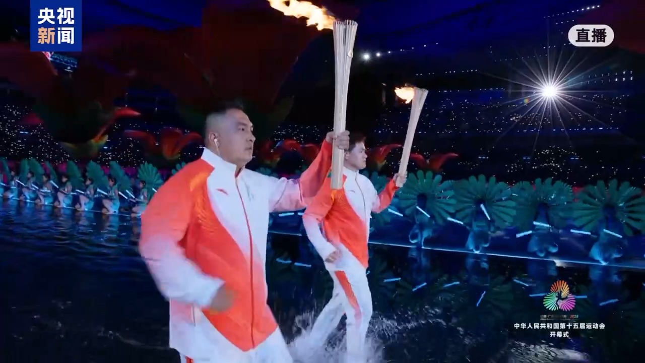 11月9日20时,十五运会开幕式在广东奥林匹克体育中心举行。在开幕式主火炬点燃仪式中,来自全国的优秀运动员代表手持采自南海1522米深处的圣火踏浪而来,经过传递,最终由来自粤港澳三地的火炬手苏炳添、张家朗、李祎最终共同点燃圣火。