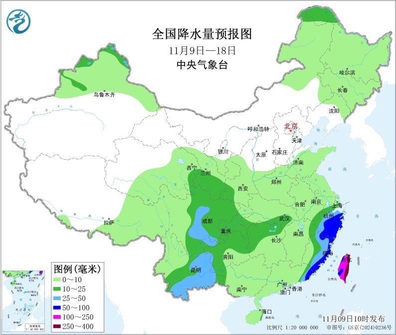 未来10天(11月9-18日),新疆北部、甘肃东部、四川盆地、江南东部和西部、福建东部、台湾岛、云南中东部和贵州西部等地的部分地区有10~30毫米,受台风“凤凰”影响,东南沿海部分地区降雨有50~120毫米,台湾岛局地超过250毫米;上述部分地区降水量较常年同期偏多3~6成,部分地区偏多1倍以上,我国其他大部地区降水较常年偏少。