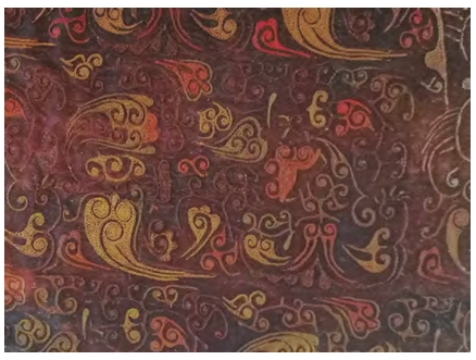 此外,从出土位置观察,海昏侯墓出土锁绣在南回廊的漆箱残片上和棺板正面上。从颜色上观察,经两千余年依旧艳丽,未见褪色之状。侧面反映了海昏侯这一显赫墓主生活的片段。