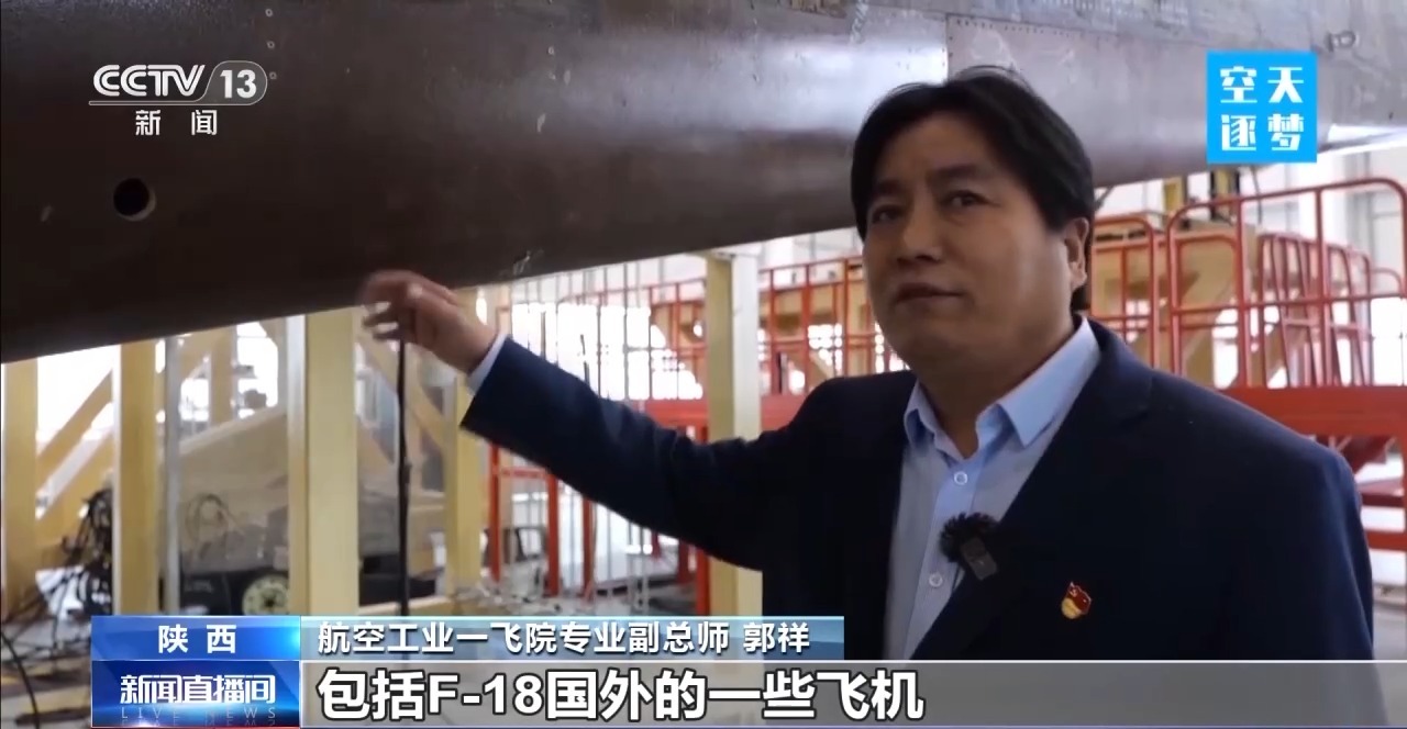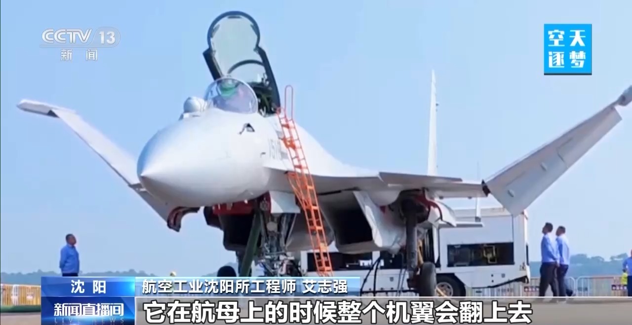 *航空工业一飞院专业副总师 郭祥:*对,歼-15T、歼-35,包括F-18,国外的一些飞机,他们基本上就是这样一个构型,这样一个折叠,就垂直向上折叠,我们飞机就像跳舞一样,因为是这样折叠就跟舞蹈一样,扇形的折叠。