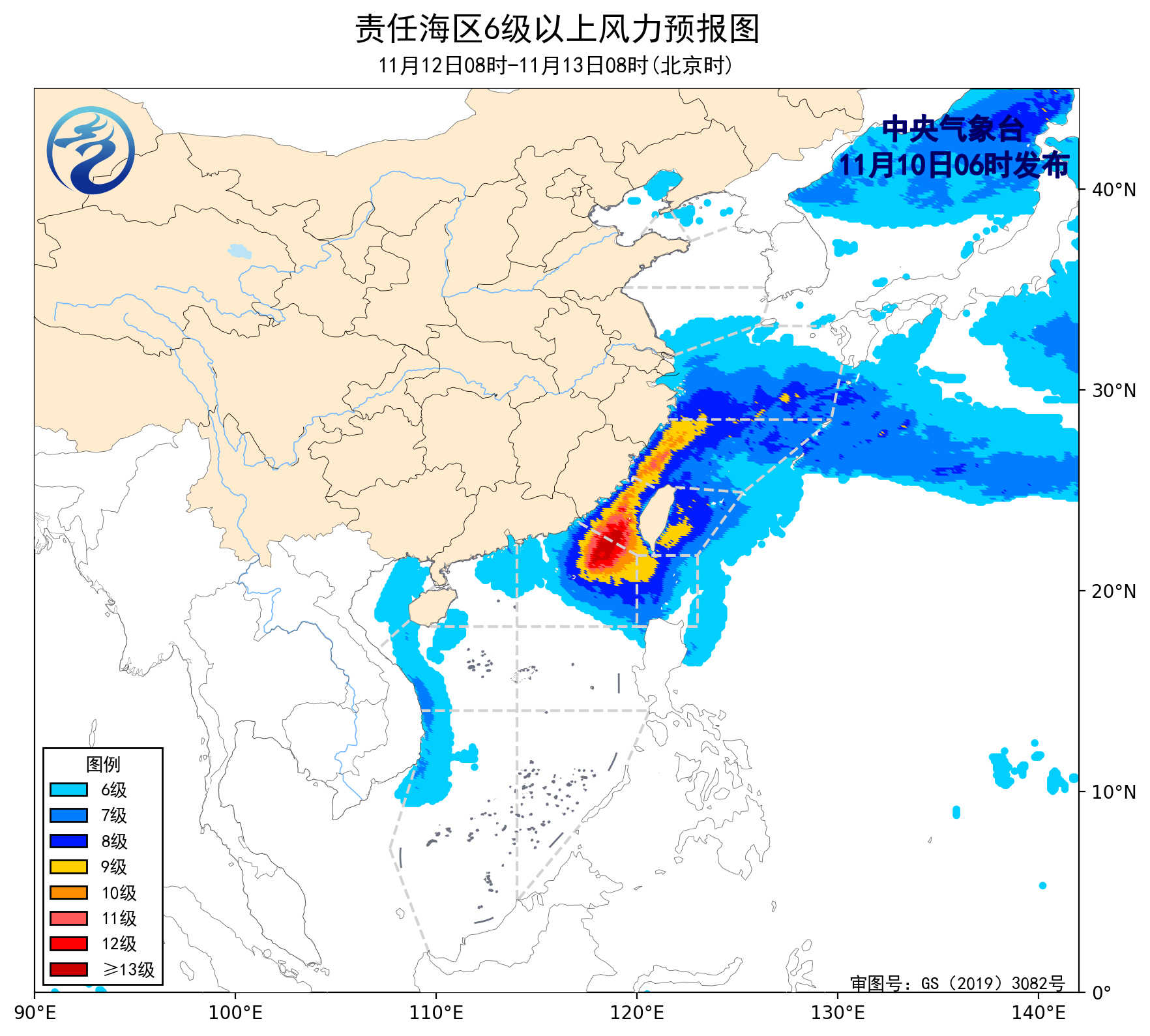 12日08时至13日08时,东海大部海域、台湾海峡、台湾以东洋面、巴士海峡、南海东北部海域将有7~9级、阵风10~11级的大风,其中南海东北部海域、台湾海峡、东海西南部部分海域的风力可达10~11级,阵风12~13级,台风“凤凰”中心经过的附近海域风力有12级,阵风13~14级。