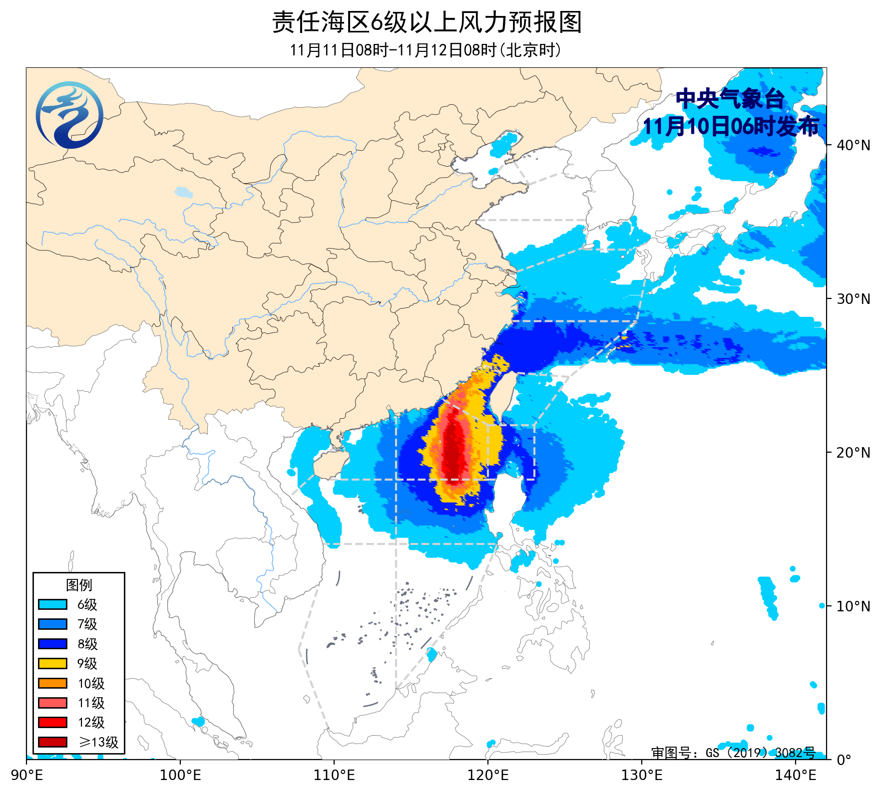 10日08时至11日08时,东海南部海域、台湾以东洋面、南海大部海域将有6-8级、阵风9-10级的大风,台湾海峡、巴士海峡、南海东北部和中东部的部分海域风力可达9-11级,阵风12-13级,台风“凤凰”中心经过的附近海域和地区风力可达12-14级,阵风15-16级。