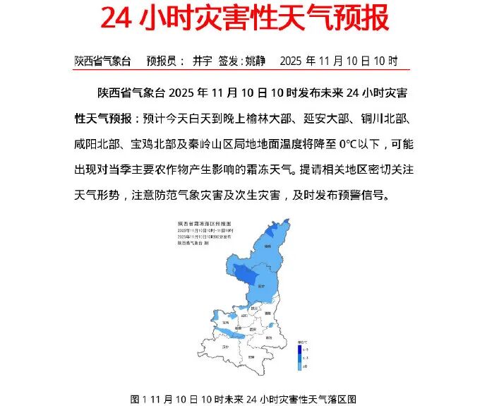 预计今天白天到晚上榆林大部、延安大部、铜川北部、咸阳北部、宝鸡北部及秦岭山区局地地面温度将降至0℃以下,可能出现对当季主要农作物产生影响的霜冻天气。提请相关地区密切关注天气形势,注意防范气象灾害及次生灾害,及时发布预警信号。