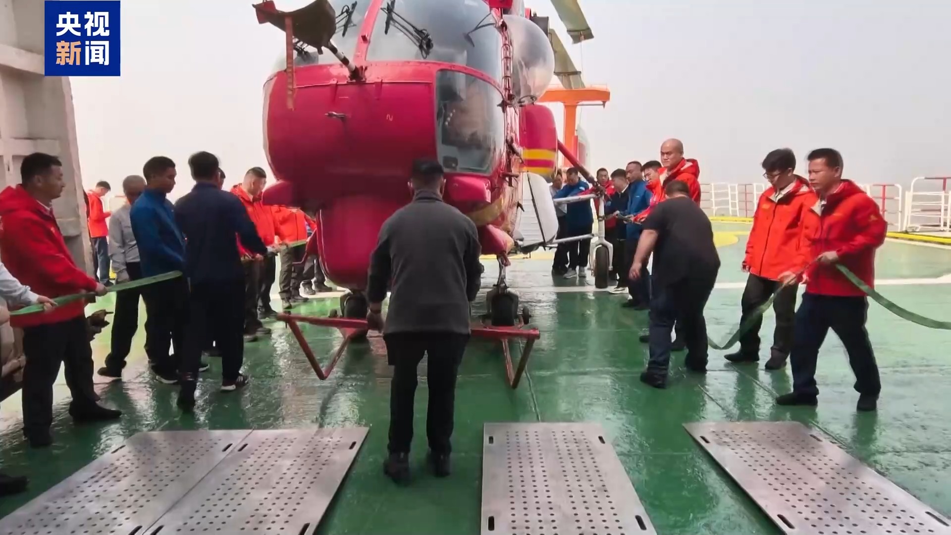 经过多次调整后,大家终于齐心协力将直升机停靠到位。