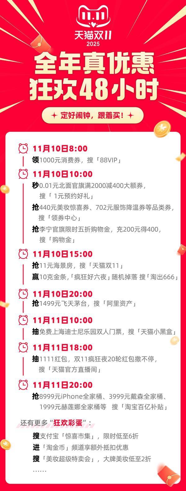 狂欢48小时,定好的每个闹钟,都是最划算的抢购时机!全年真优惠的天猫双11,现货开卖至11月14日晚24点。