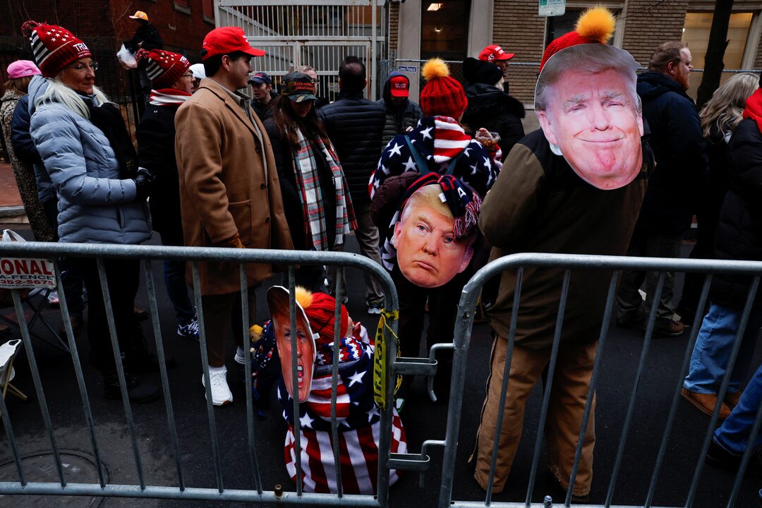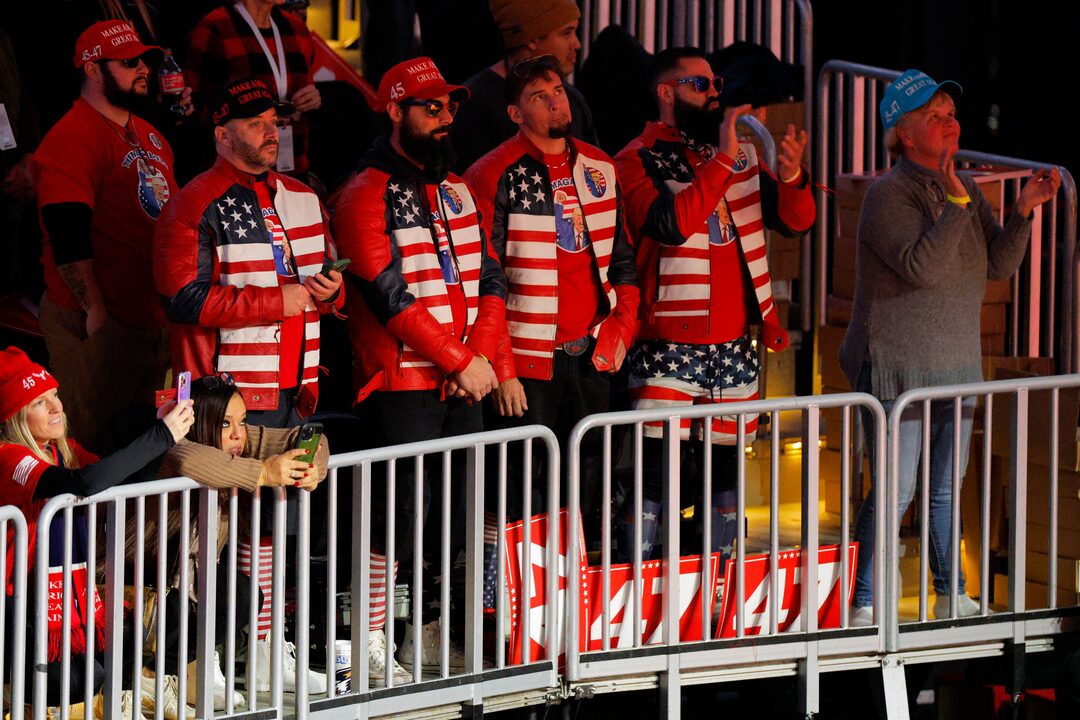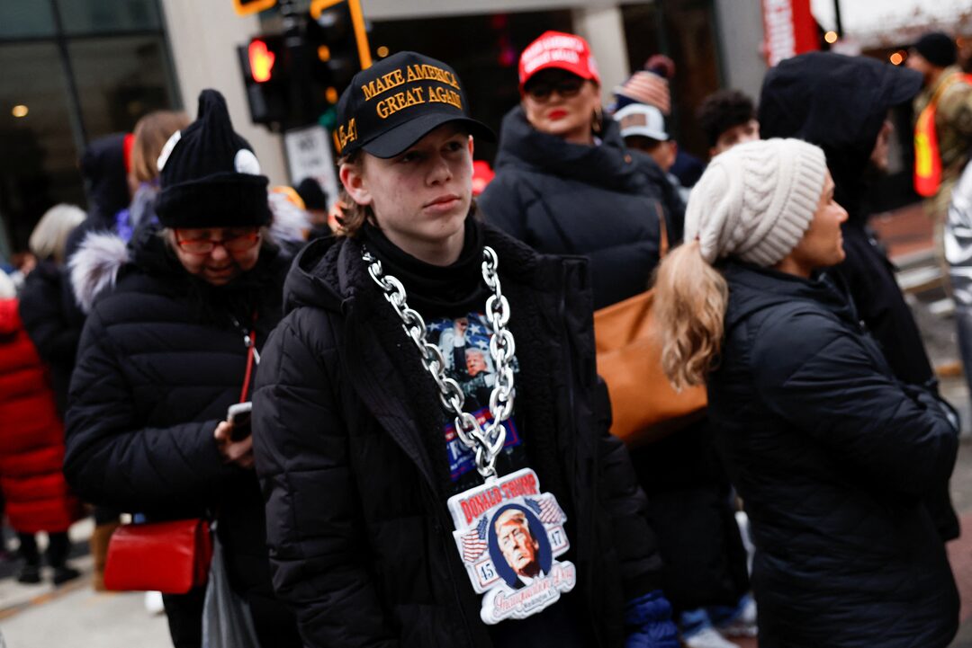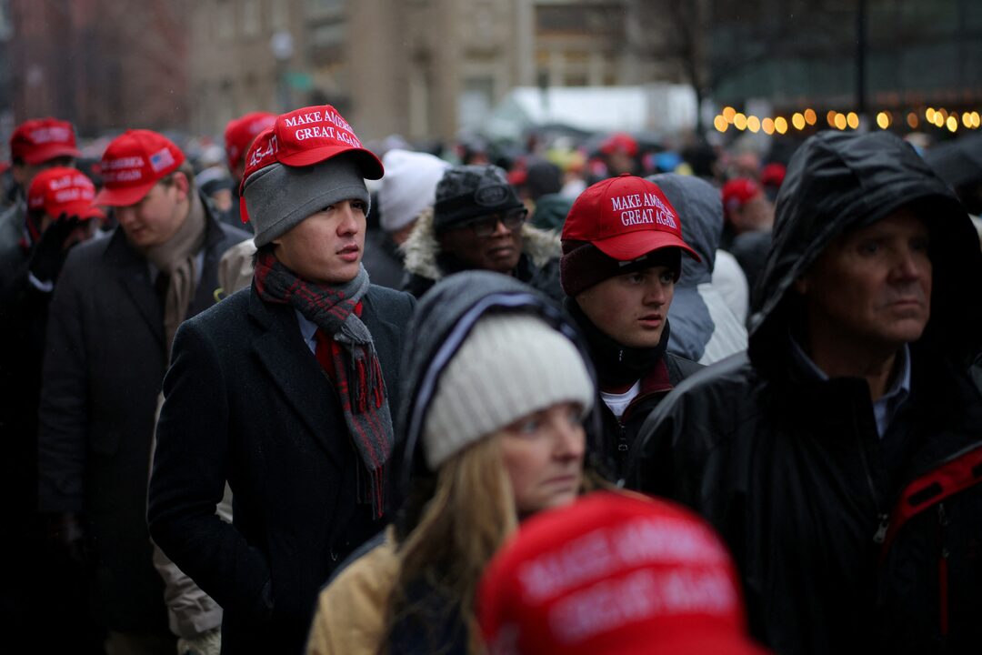 在活动之前,特朗普的支持者们,许多人穿着红色夹克和标志性的MAGA帽子,在华盛顿市中心的几条街道上冒着寒冷和倾盆大雨等待,部分人高呼“美国!美国!”