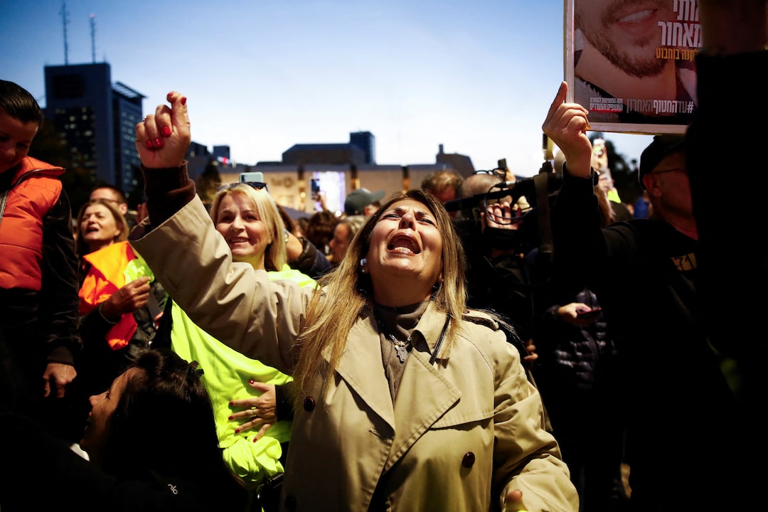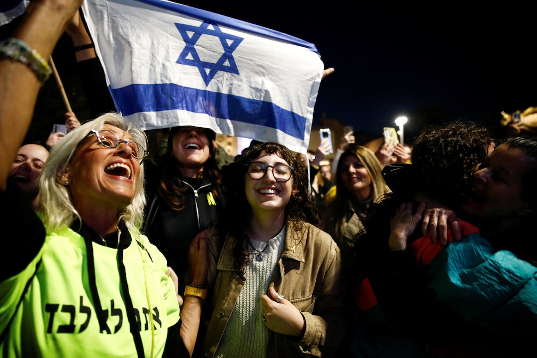 在特拉维夫,数百名以色列人在国防总部外的广场上欢呼和流泪,当加沙的现场直播显示三名女性人质走进一辆被哈马斯战士包围的红十字会车辆时。以色列军方表示,罗米·戈嫩、多伦·施泰因布雷赫和艾米莉·达马里已与她们的母亲团聚,并发布了一段视频,显示她们的健康状况良好。达马里在被绑架的那天失去了两个手指,她微笑着拥抱母亲,举起包扎的手。