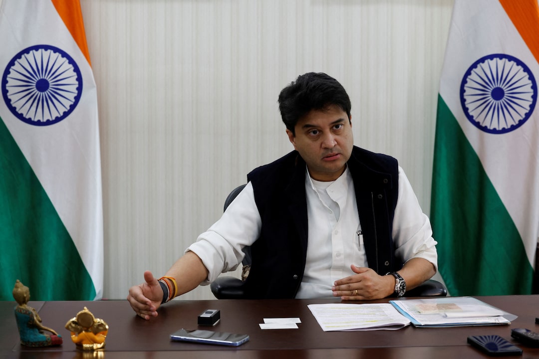 第1项,共2项 印度电信部长乔蒂拉迪提亚·辛迪亚在2025年1月20日于印度新德里接受路透社采访时做出手势。路透社/普里扬舒·辛格